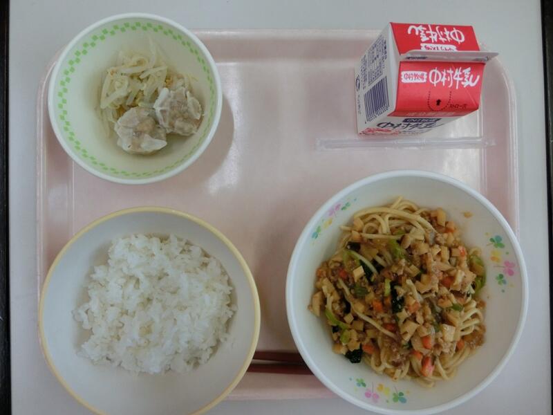 ジャージャー麺は、中国の家庭料理です。ジャージャー麺は、豚のひき肉やたけのこ、しいたけなどを味噌で味付けしたものを麺の上にのせた料理のことをいいます。給食では、にんじん、たまねぎ、ねぎ、チンゲン菜などたくさんの具が入っています。栄養たっぷりのジャージャー麺をおいしくいただきました。