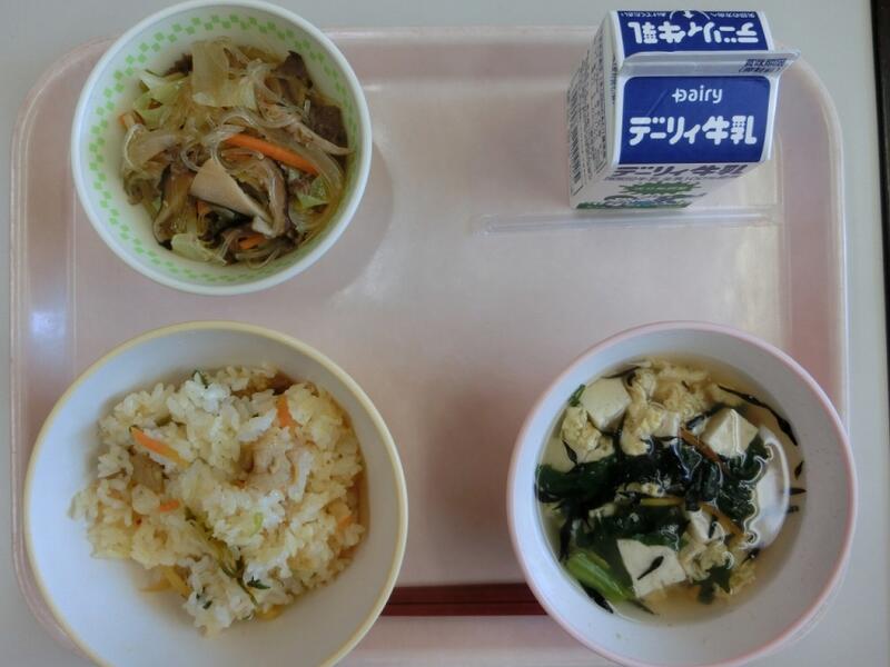 野菜には、葉を食べるものや茎を食べるもの、花を食べるものなどがあります。根菜は、じゃがいもや大根、かぶ、にんじん、ごぼうのように、根っこが大きく育った野菜です。根菜類には、でん粉やビタミンが豊富なものも多くあります。今日は、大根、ごぼう、にんじんの根菜を使った汁ものです。しっかりと噛んで食べていた子どもたちでした。