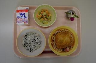 今日は「きつねうどん」です。「甘辛く煮た油揚げ」をのせて食べるうどんです。なぜ、きつねという名前がつくかというと、きつねの大好物が油揚げだとされているからだそうです。大阪では、油あげをのせたうどんを「きつね」、油あげをのせたそばを「たぬき」というそうです。料理の呼び方は、その地方でいろいろあるんですね。