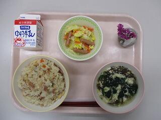今日は、さけのそぼろ丼の鮭の話です。鮭のオスは秋にふるさとの川に近付くと、鼻の先がだんだん曲がってきます。北海道を中心に、川に上る前のさけを沿岸で捕獲したものが「秋さけ」で、旬の走りほどおいしいといわれます。北海道では、「秋鮭」とかいて「あきあじ」と読みます。今日の鮭は、秋に獲れた鮭を使っています。ごはんにかけて食べて下さい。