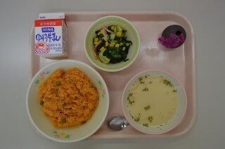 お米を食べているのは日本だけではありません。世界各国でお米を使ったごはん料理は食べられています。日本では、牛丼や親子丼などのどんぶり。スペインではパエリア。中国ではチャーハン。お隣の韓国では今日の給食「ビビンバ」などがあります。ビビンバとは、韓国の混ぜご飯のことで、「ビビン」が混ぜる「バ」がご飯という意味です。ビビンバには、いろいろな種類があり、中に入っている材料も様々です。今日のビビンバには、豚肉、もやし、にんじん、ほうれん草、卵などたくさんの材料を使っています。残さず食べてくださいね。