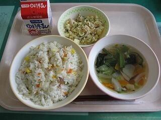 今日は梅ごはんです。1年生がG授業で作った梅干しもそろそろできた頃でしょうか?梅干しはすっぱいですが、そのすっぱい成分には食欲がでるように助けたり、疲れをとったりする働きがあります。それに、ばい菌をやっつける働きもあるので、お弁当やおにぎりに入れるといたみにくくなります。暑い夏にぴったりの食べ物ですね。