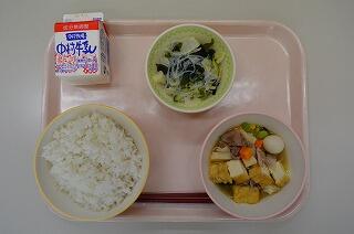 チャプチェとはお隣の国、韓国の春雨を炒めた料理のことです。韓国料理には他にどんなものがあるか知っていますか?有名なものはキムチです。他にもビビンバやプルコギ、チジミやナムルなどがありますが聞いたことがあるでしょうか?他にもたくさんあるので調べてみましょう。今日のチャプチェに入っているたけのこやしいたけは噛みごたえがあり、スープに入っているひじきや小松菜はカルシウムが豊富です。今日も歯と口の健康によい給食です。よくかんで食べましょう。