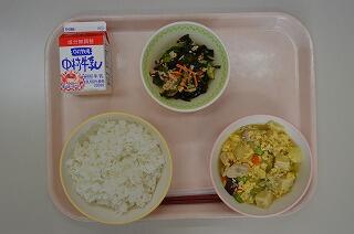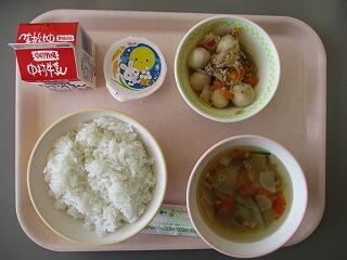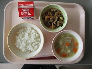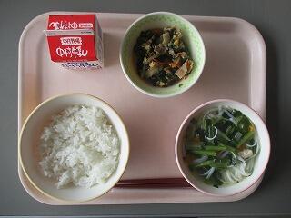 今日の給食は、ご飯、煮物、和え物という「和食」です。この他に汁ものを組合わせた「一汁三菜」が和食の基本的な献立です。平成25年に、「和食」がユネスコの無形文化遺産に登録されました。世界中が和食に注目しています。それは、日本では、季節や地域ごとに、新鮮な食材を生かした料理が昔から作られてきたことが魅力の一つです。みなさんは、春夏秋冬の四季があるのは、日本だけということを知っていましたか?1年中暑い国もあれば、寒い国もあります。そこで作られる食べ物は限られています。また、昆布や煮干しからとっただしには「うまみ」がたっぷりでています。その「うまみ」で汁や煮物を作るため、おいしさがまして味付けに使う調味料が少なくて済みます。薄味でいつまでもあきのこない味に仕上がります。この「うまみ」は他の国にはない食文化です。日本特有の食文化を受け継いでいきたいですね。