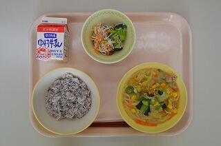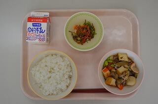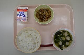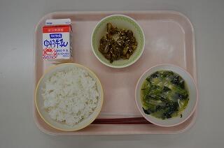 今日の給食は、ご飯、煮物、和え物という「和食」です。この他に汁ものを組合わせた「一汁三菜」が和食の基本的な献立です。平成25年に、「和食」がユネスコの無形文化遺産に登録されました。世界中が和食に注目しています。それは、日本では、季節や地域ごとに、新鮮な食材を生かした料理が昔から作られてきたことが魅力の一つです。みなさんは、春夏秋冬の四季があるのは、日本だけということを知っていましたか?1年中暑い国もあれば、寒い国もあります。そこで作られる食べ物は限られています。また、昆布や煮干しからとっただしには「うまみ」がたっぷりでています。その「うまみ」で汁や煮物を作るため、おいしさがまして味付けに使う調味料が少なくて済みます。薄味でいつまでもあきのこない味に仕上がります。この「うまみ」は他の国にはない食文化です。日本特有の食文化を受け継いでいきたいですね。