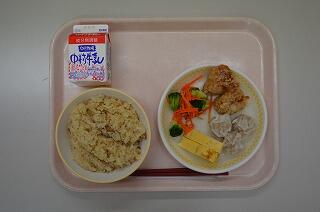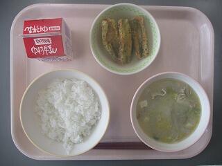 皆さんはちくわが何から作られているか知っていますか?ちくわは魚の身を使って作られる食べ物です。味付けした魚のすり身を、ぼうに巻きつけ焼いて作られます。その他にも、魚のすり身をつかって作られる食べ物に、かまぼこやはんぺんなどもあります。今日はちくわに青のりを混ぜて作った衣をつけて揚たげ磯辺揚げです。お味はいかがですか?青のりの風味とちくわの食感を味わって残さず食べましょう。