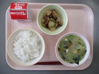 今日は、厚揚げの中華煮の主役「厚揚げ」についてのお話です。厚揚げは、豆腐を揚げて作られます。揚げることによってまわりがかたくなるので、今日のような煮物に入れても崩れにくくなります。ところで、厚揚げの材料である豆腐は何からできているか知っていますか?「畑の肉」と言われるほどの栄養がつまった「大豆」です。大豆は、肉と同じ赤の食べ物の仲間で、血液や筋肉、皮膚や髪の毛などみなさんの体をつくるもとになる食べ物です。もちろん、大豆から作られる厚揚げや豆腐も赤の食べ物の仲間です。残さず食べましょう。
