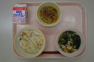 今日はキムたくごはんです。なぜ「キムたく」と言うのでしょう。それは「キムチ」と「たくあん」が入っているからです。このキムたくご飯は長野県塩尻市の学校給食で生まれた人気のメニューです。テレビでも紹介されて全国各地で食べられるようになりました。日本の伝統的な保存食の一つである漬けものを食べなくなった子どもたちに、漬けものを食べてもらいたいと思って考えられたメニューです。お味はいかがですか?