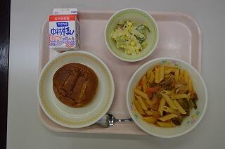 今日は「ペンネ」というパスタ料理です。パスタが日本で作られたのは、明治時代に長崎県でマカロニ工場が建てられ、そこで作られたのが始まりといわれています。その頃パスタは珍しく、高級なホテルでしか食べることができないものでした。そんなパスタの一つにペンネがあります。ペンネは、スパゲティの仲間でイタリア語で『ペンの先』という意味があります。形がペンの先のようになっていて、表面には細かい溝がありソースがからみやすくなっています。みなさんの体を動かすエネルギーのもとになる黄色の食べ物の仲間です。しっかり食べて体を動かしましょう。