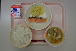 今日は冬を代表する野菜「白菜」についてのお話しです。白菜は昔から日本にある野菜のように思えますが、白菜のふるさとは中国です。中国では、2000年以上も前から作られていましたが、日本で作られるようになったのは、明治時代になってからだそうです。寒くなればなるほど甘みがましておいしくなります。今の季節は、鍋物に欠かせない野菜ですね。白菜に含まれる「カリウム」は、とり過ぎた塩を体から出してくれる働きがあります。今日は、スープにしています。残さずいただきましょう。