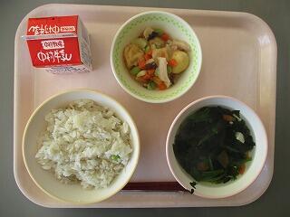 給食では、ごはんに麦をまぜた「麦ごはん」をいつも出しています。大麦は優れた栄養価を持つ食品で、特に食物繊維を多く含んでいます。これは、白ごはんだけの時と比べて17倍以上、繊維の宝庫と言われているサツマイモと比較しても4倍も多い量となります。食物繊維は、腸の環境を整える働きをしてくれるので毎日のみなさんの体にとても良いということです。好き嫌いなく、いろんな食べ物をバランス良く食べていきましょう。