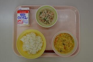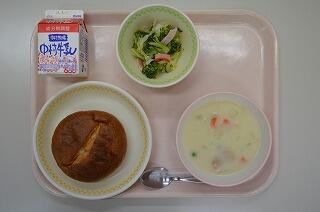 今日はパンです。パンを食べているその手はきれいですか?手には目に見えないばい菌がたくさんいます。せっけんをよく泡立てて、手のひらや手の甲をしっかり洗います。忘れがちな指と指の間、つめ、手首、親指のつけ根などもよく洗って、水で流します。きれいなハンカチでふくことも忘れずに。ばい菌をしっかりおとして気持ちよく給食を食べましょう。