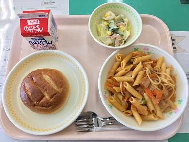 今日は「ペンネボロネーゼ」というパスタ料理です。パスタが日本で作られたのは、明治時代に長崎県でマカロニ工場が建てられ、そこで作られたのが始まりといわれています。その頃パスタは珍しく、高級なホテルでしか食べることができないものでした。そんなパスタの一つにペンネがあります。ペンネは、スパゲティの仲間でイタリア語で『ペンの先』という意味があります。形がペンの先のようになっていて、表面には細かい溝がありソースがからみやすくなっています。ボロネーゼとはひき肉やトマトをつかった、イタリアのボローニャ地方の料理です。ペンネは、みなさんの体を動かすエネルギーのもとになる黄色の食べ物の仲間です。しっかり食べて体を動かしましょう。