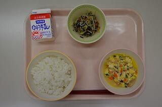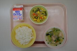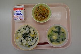 今日の菜の花ごはんには何が入っているでしょう。実は、残念ながら本物の菜の花は入っていません。卵の黄色と小松菜の緑で春の菜の花をイメージしています。それにちりめんやごまを混ぜてカルシウムたっぷりの春らしい混ぜご飯ができました。お味はいかがですか?暖かい春の風を感じながら、今日もおいしくいただきましょう。