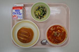 今日はチンジャオロースーです。下味をつけた牛肉の千切りとたけのこ、にんじん、ピーマンなどの野菜を細切りしたものを炒めた料理です。牛肉にはからだを作るための上等なたんぱく質をたっぷり含んでいます。また、からだを動かす為のエネルギーになる脂肪も含んでいます。ピーマンが苦手な人も、牛肉と一緒に炒め、オイスターソースのうまみや、ごま油の風味できっとおいしく食べられると思います。チャレンジしてみてください。