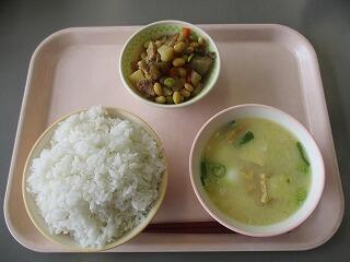今日の給食は、ご飯、煮物、和え物、汁物という「和食」です。平成25年に、「和食」がユネスコの無形文化遺産に登録されました。世界中が和食に注目しています。それは、日本では、季節や地域ごとに、新鮮な食材を生かした料理が昔から作られてきたことが魅力の一つです。みなさんは、春夏秋冬の四季があるのは、日本だけということを知っていましたか?それぞれの季節にとれる旬の食材を使い、昆布や煮干しからだしをとり、だしのうまみで汁物や煮物を作ります。この「うまみ」というものも他の国にはない食文化です。自然を大切にしてきた人たちの食文化を私たちも受け継いでいきたいですね。今日の和食のお味はいかがですか?