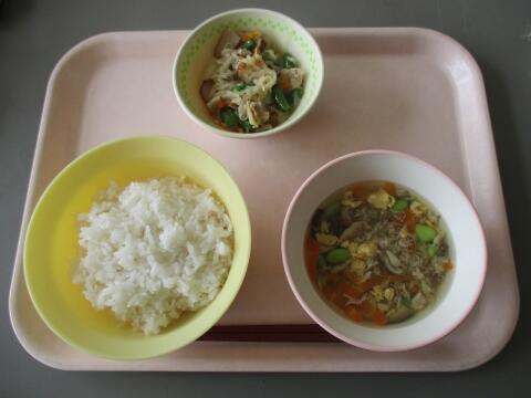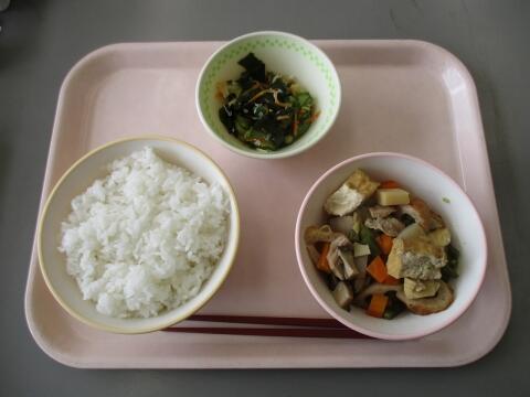 今日は、あじ茶漬けです。あじのほぐし身の入った具をごはんにかけて、上からスープをかけて食べて下さい。残暑が残る今の季節にピッタリですね。さらさらとかまずに食べてしまいがちですが、よくかんで食べて下さいね。