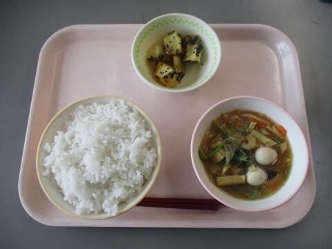今日は秋の味シチューです。さつまいもやしめじなど秋の食べ物を使ったシチューです。みなさんは「さつまいも」という名前はどうやってついたか知っていますか?それは、もともとは中国から沖縄に伝わったさつまいもですが、沖縄から鹿児島に伝わり、そこから全国へと広がっていったことに関係します。昔は、鹿児島のことを「薩摩」と呼んでいたため、「薩摩の芋」として広がり、やがて「さつまいも」となったと言われています。さつまいもは甘くておいしいだけでなく、お腹のなかを掃除してくれる「食物繊維」がたくさん含まれた食べ物です。お腹が元気できれいだと気分もすっきりして勉強や運動も頑張れるようになります。残さず食べましょう。