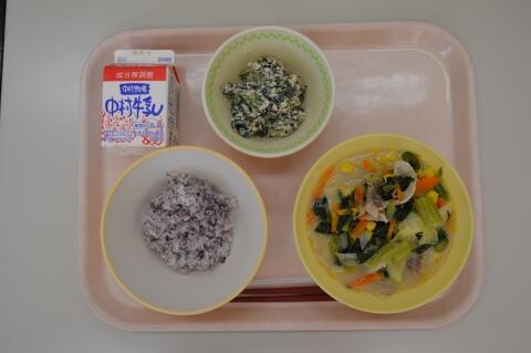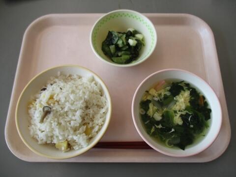 今日は秋の味覚を入れた秋味ごはんです。栗は秋が旬の果物です。秋にはおいしい食べ物がたくさん収穫されますし、食欲も出てきます。食欲の秋、スポーツの秋、読書の秋・・・などいろいろありますが、皆さんはどんな秋にしたいですか?スポーツをする上でも、読書や勉強をする上でも大事なのは1日3回のバランスのとれた食事や睡眠がとっても大事です。充実した秋を過ごすために「早寝・早起き・朝大豆」を心がけましょう。