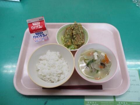 皆さんはちくわが何から作られているか知っていますか?ちくわは魚の身を使って作られる食べ物です。味付けした魚のすり身を、ぼうに巻きつけ焼いて作られます。その他にも、魚のすり身をつかって作られる食べ物に、かまぼこやはんぺんなどもあります。今日はちくわに青のりを混ぜて作った衣をつけて揚たげ磯辺揚げです。お味はいかがですか?青のりの風味とちくわの食感を味わって残さず食べましょう。