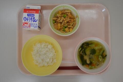 今日はツナそぼろ丼です。「ツナ」とはまぐろのことです。まぐろには、脳の働きに効果のあるDHA(ディーエイチエー)やEPA(イーピーエー)がたくさん含まれています。これらを多く摂ると、記憶力や注意力、判断力などを維持し、学習能力が上がるといわれています。また、血液の流れもよくなり、病気の予防にも効果があると言われています。また、今日はツナと一緒に大豆製品である「高野豆腐」も一緒に入っています。しっかり食べて午後からの学習も頑張ってください。