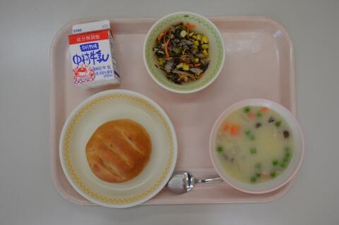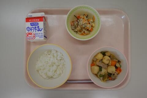 今日は秋の味シチューです。さつまいもやしめじなど秋の食べ物を使ったシチューです。みなさんは「さつまいも」という名前はどうやってついたか知っていますか?それは、もともとは中国から沖縄に伝わったさつまいもですが、沖縄から鹿児島に伝わり、そこから全国へと広がっていったことに関係します。昔は、鹿児島のことを「薩摩」と呼んでいたため、「薩摩の芋」として広がり、やがて「さつまいも」となったと言われています。さつまいもは甘くておいしいだけでなく、お腹のなかを掃除してくれる「食物繊維」がたくさん含まれた食べ物です。お腹が元気できれいだと気分もすっきりして勉強や運動も頑張れるようになります。残さず食べましょう。