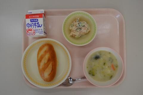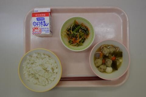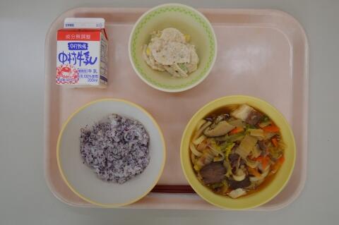 2月ももう終わりに近づきましたが、まだまだ寒いですね。今日は「ふぶき汁」です。なぜふぶき汁と言うのでしょう?それは豆腐をつぶして雪がふぶいている様子を表しているからです。本当のふぶきは体の芯から冷えていやですが、給食のふぶき汁は具だくさんで温かく、体がポカポカしてきますね。