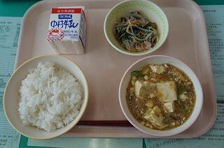 ① 麦ご飯 ② マーボー豆腐 ③ 中華風サラダ ④ 牛乳でした。ピリ辛抑えめの少し甘めのマーボー豆腐でしたので、子どもたちは抵抗感なく食べることができると思います。サラダもちょうど良い味付けがされていましたので、こちらも子ども向きかと思います。本当にいつも、おいしい給食がいただけて、ありがたく思います。