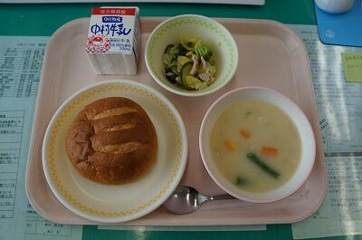 パンは、今月2度目です。あんまりパンの日がないので、貴重なパンを大切に食べます。ほかほかで柔らかく、とてもおいしいですよ。ブロッコリーサラダは、ドレッシングが少し酸っぱく感じましたが、さわやかでおいしかったです(*^▽^*)クリームシチューは、定番ですので、みんな大好きでしょう。