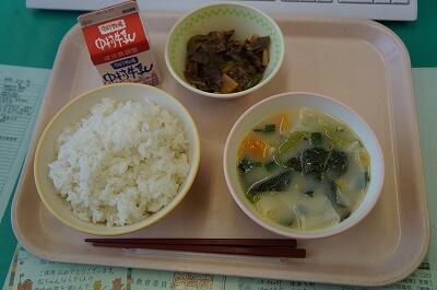 ○ 麦ご飯 ○ 大豆の磯煮 ○ なめこのみそ汁 ○ 牛乳でした。