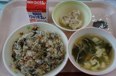 のりをまぶして、韓国風ちらし寿司を食べるとのりの風味が良く、韓国風ちらし寿司の味を盛り上げます。予想に反して、全体的に甘めの味付けでした(^▽^)わかめスープはちらしに良く合う味付けになっていたと思います。シューマイは、当然裏切らないおいしさでした。給食のおかげで、今日も元気に週の始めをスタートさせることができます。