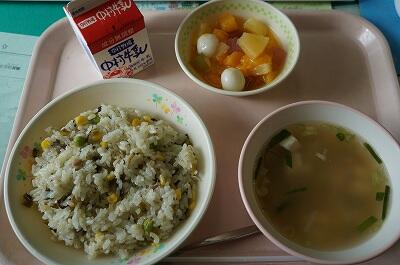 高菜チャーハンは、高菜の歯ごたえのある食感が良く、味付けもGOODで、とてもおいしかったです。きのこスープもコンソメ風でおいしかったです。その後のデザートがフルーツポンチでしたが、これはきっと、少しでも食缶に残っていたら、争奪戦になることでしょう。子どもたちは、それくらいフルーツポンチが大好きですよね~。