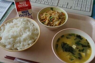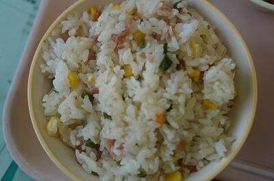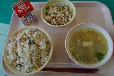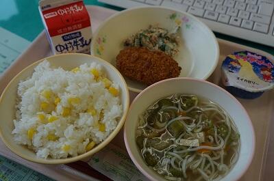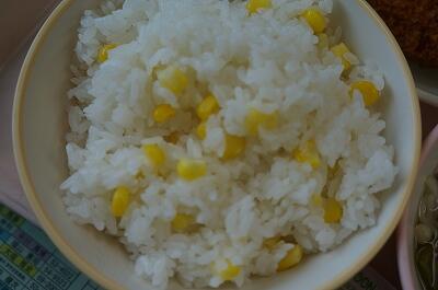 今日はメニューが多いですよ~。先ずは、コーンご飯。コーンの甘味がおいしいご飯です。コーンのシャキシャキ感もいいですね。