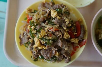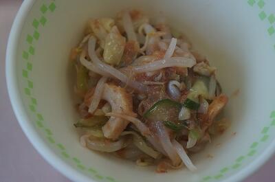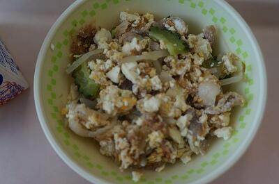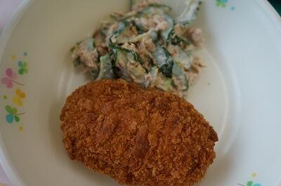 続いて、牛肉コロッケとゴーヤのおかか和え。こちらは、コロッケがジャガイモの甘味が程良く、牛肉も入っていて美味かったです。ゴーヤのおかか和えは、キュウリも少し交えていて、苦みを抑えているようでした。マヨネーズ味がピッタリで、とても美味しかったです。私の中では、今日の一押しです(*^▽^*)