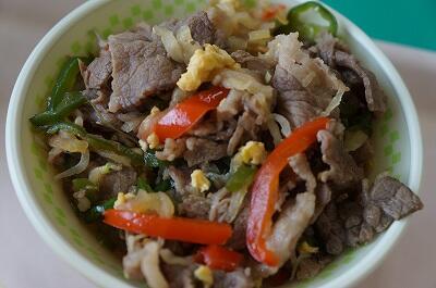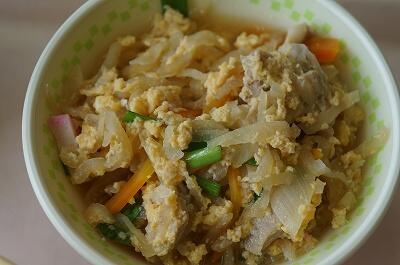 千切り大根の卵とじは、濃いめの味付けで、ニラが効いていて、とてもおいしかったです(*^▽^*)途中からご飯にかけて食べました。千切り大根の卵とじ丼のできあがりです。