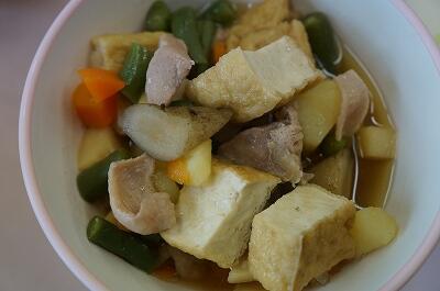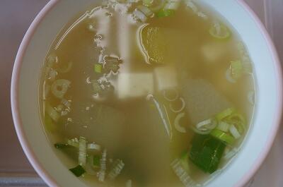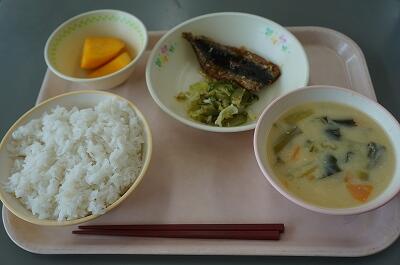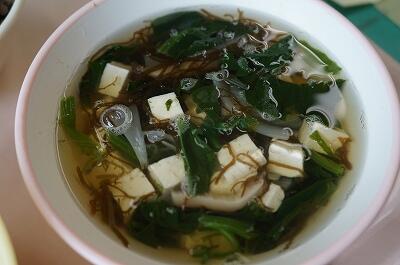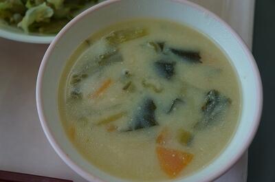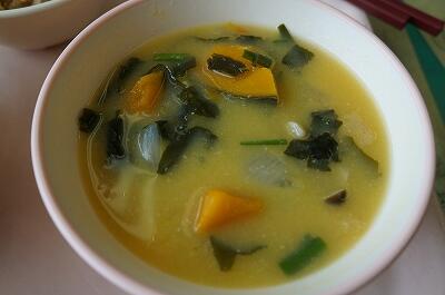かぼちゃのみそ汁は、みそ汁の色が黄色くなるほどかぼちゃの甘味がよく出ていて、こちらもとてもおいしかったです。やはり、ごはんにはみそ汁が合いますね(*^▽^*)