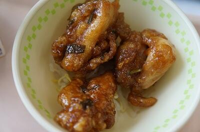 ユーリンチーは、揚げた鶏に風味のいいタレがかかっていて、ジューシーかつ皮パリパリのいいお味でした。中国広東省の料理みたいです(*^▽^*)この下に、ゆでもやしが隠れております<(_ _)>