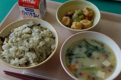 今日のような給食のメニューは、ホッとしますね(*^▽^*)高菜ご飯は、絶品です。みんなに食べていただきたい代物です。高菜とちりめんの相性が最高ですよ。