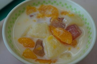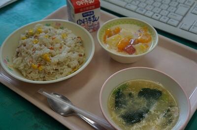 そして最後にデザートのフルーツヨーグルトを食べます。冷たくておいしいです。子どもたちの大好きなメニューだと思います。100点満点です(^_^)v
