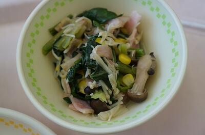 きのこのソテーは、地元の特産センターで買った緑鮮やかなほうれん草が入っていました。なかなかいいですね~(*^▽^*)
