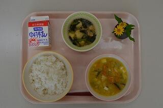 かぼちゃのような、色の濃い野菜を、何野菜といいますか?6年生以上は、家庭科で学んでいると思います。正解は、緑黄色野菜です。今日のような、緑黄色野菜の成分は、のどや鼻の粘膜を強くし、菌の侵入を防ぐ働きがあります。風邪が流行り始める季節です。残さずいただきたいですね。