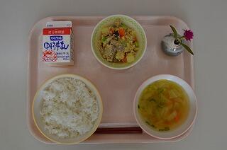 今日は「卵」の話です。卵は、体をつくるもとになる食品で、たんぱく質を多く含んでいます。たんぱく質の他にも、鉄や亜鉛、ビタミンB2を多く含んでいます。ビタミンCだけが、ふくまれていないので、ビタミンCを多くふくんだ野菜などと一緒に食べると、栄養のバランスがよくなります。今日は卵とじにしています。味わっていただきましょう。