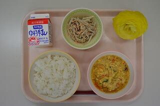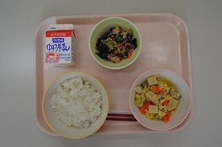 給食では、たびたび豆の料理が登場します。豆は、植物の種ですね。この種を土に植えて、水をかけると、植物が育ちます。つまり、豆には生きる力がたくさん詰まってます。植物には、人間の体ではつくることができない栄養素、ビタミンをつくることができます。人間が体の中でエネルギーをつくるためには、このビタミンが必要です。今日は、豆が姿をかえた、豆腐になって、マーボー豆腐として出しています。