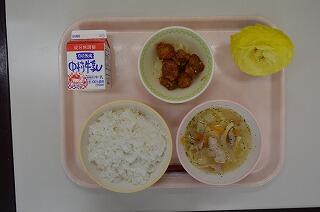 今日は、食べ物クイズです。問題です。2つのヒントがあります。ヒント① この食べ物は、今日の給食の中に入っていて、今が旬のいもです。ヒント②だんしゃく、メークイン、キタアカリなど、たくさんの種類があります。さて、この食べ物は、何でしょう?・・・正解は、じゃがいもです。ほくほくとした食感が特徴の「だんしゃく」は、サラダにします。食感が滑らかで、煮崩れしにくい、「メークイン」は肉じゃがなどの煮物に使います。今日はメークインを使っています。