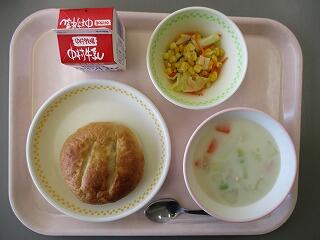 学校のシチューは、具だくさんで、やさしい味がして、おいしいですね。給食室で朝から小麦粉とバターをいためてホワイトルウをつくり、牛乳をたっぷりいれて作っているんですよ。