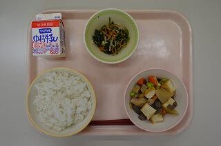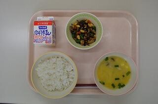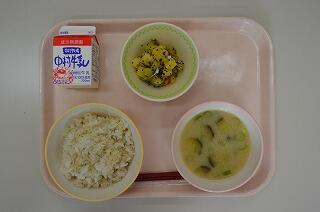 宮崎県では毎月16日を「ひむか地産地消の日」と定めています。地産地消とは地域の食材を地域で食べること(消費すること)です。今日は宮崎県の特産物である千切大根と五ヶ瀬町産のお茶を使った「千切り茶めし」です。普通ごはんは水で炊きますが、今日はお茶で炊いています。お茶の香りがするでしょうか。