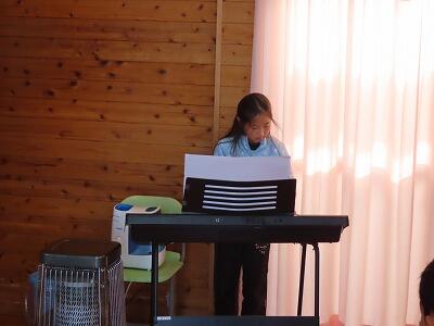 【校歌斉唱。緊張感漂う中、4年生児童が初めて一人でピアノ演奏をして、立派に大役を務めてくれました。】