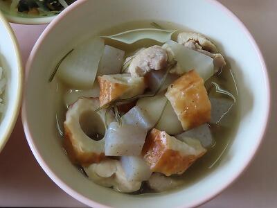 【おでん!こんにゃく、ちくわに大根、鶏肉の具だくさん。どの具にも味がしみていて、ご飯と合いました。】