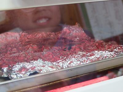 今日の小さいおかずは、白身魚のホキの上に、たまねぎ、えのき、しめじをのせ、調味料やチーズをかけて作っています。ひとつひとつ丁寧な作業が必要です。給食でこのような手作りのおかずを頂けるなんて、幸せですね。