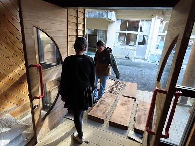 【「木目がきれい~」「ツルツル~」(表面のギザギザは、チェーンソーで作ったのだそうです。)】